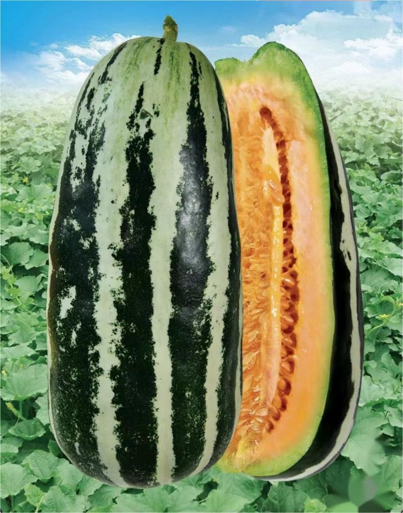 該品種為湖南省蔬菜研究所新育成的早熟甜瓜品種。春季全生育期85天左右,花后27天即可采收;秋季全生育期68天左右,花后24天即可采收。果實筒形,果皮灰白色覆墨綠色條帶,果肉桔紅色,肉質(zhì)香脆,口感嫩爽,風(fēng)味佳。果肉可溶性固形物含量16-18%,單瓜重500-600克,果肉厚2.2厘米左右。植株生長健壯,耐濕抗病,耐糖心,適應(yīng)性強,易栽培,座果性好。