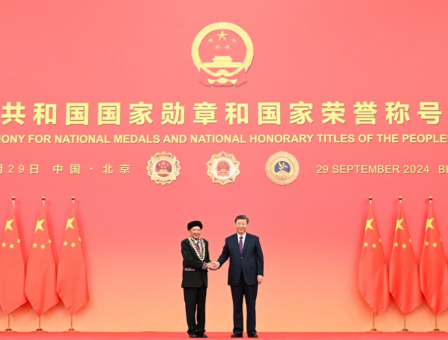 9月29日,中華人民共和國(guó)國(guó)家勛章和國(guó)家榮譽(yù)稱(chēng)號(hào)頒授儀式在北京人民大會(huì)堂金色大廳隆重舉行。中共中央總書(shū)記、國(guó)家主席、中央軍委主席習(xí)近平向“共和國(guó)勛章”獲得者黃宗德頒授勛章。新華社記者謝環(huán)馳攝