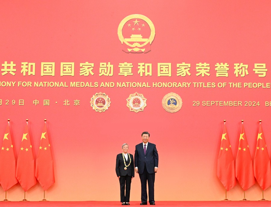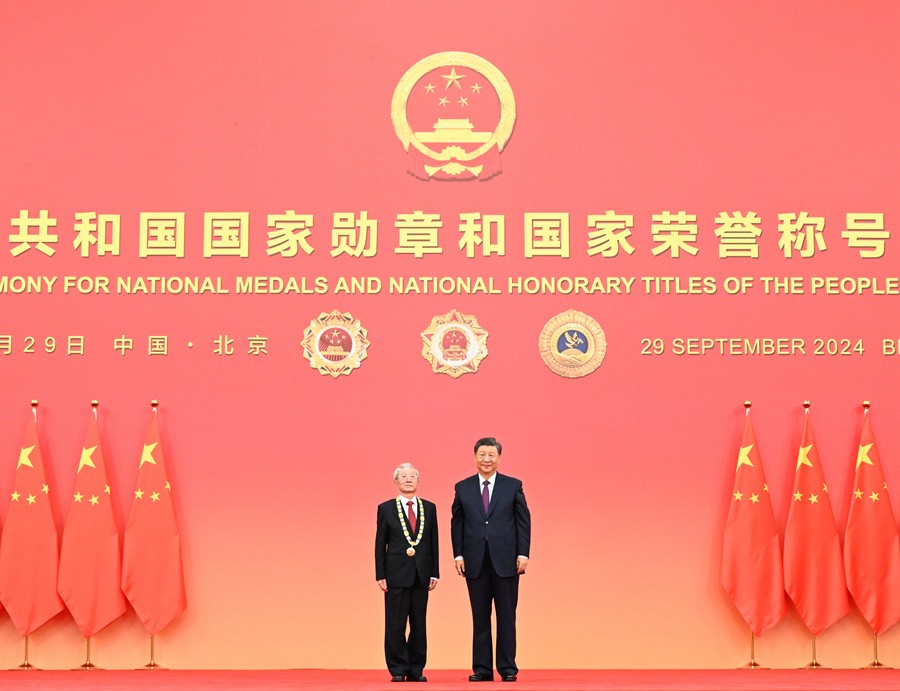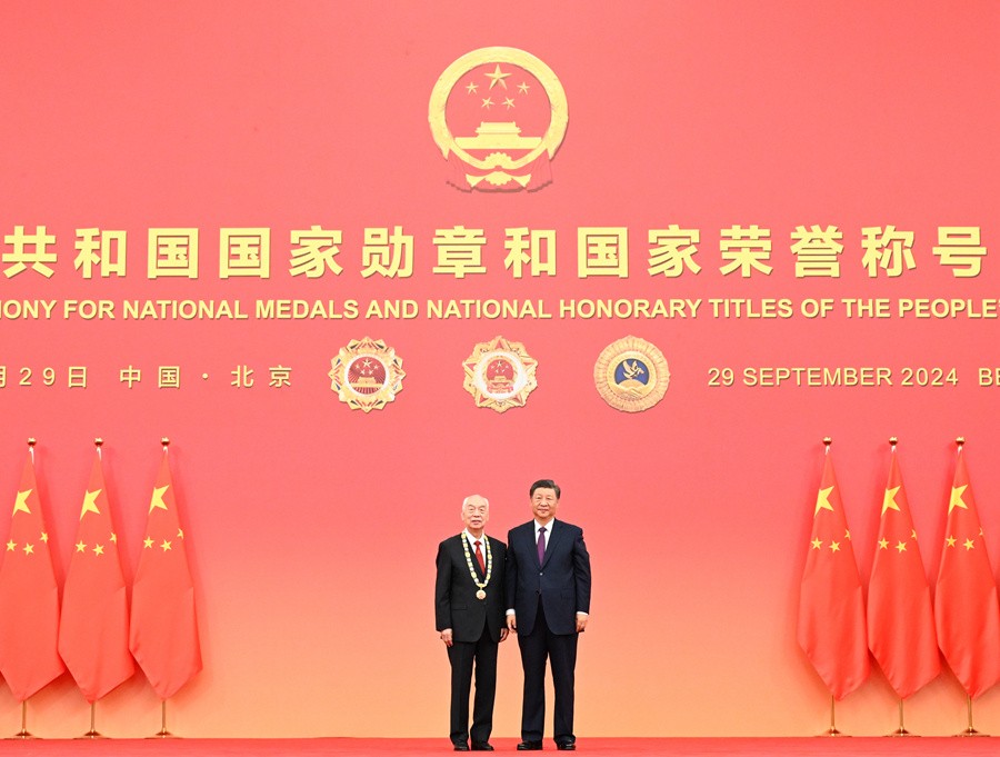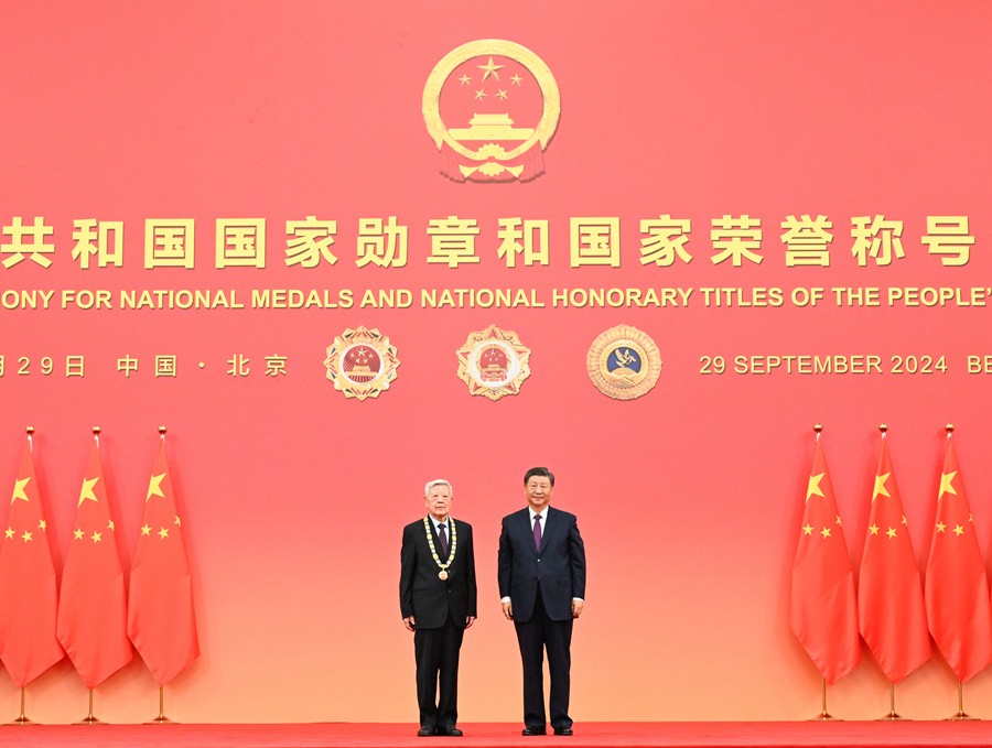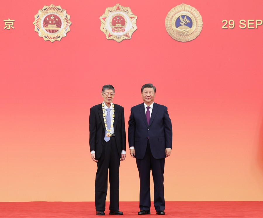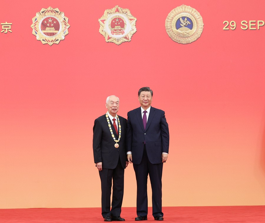 9月29日,中華人民共和國(guó)國(guó)家勛章和國(guó)家榮譽(yù)稱(chēng)號(hào)頒授儀式在北京人民大會(huì)堂金色大廳隆重舉行。中共中央總書(shū)記、國(guó)家主席、中央軍委主席習(xí)近平向“人民科學(xué)家”國(guó)家榮譽(yù)稱(chēng)號(hào)獲得者趙忠賢頒授獎(jiǎng)?wù)?。新華社記者謝環(huán)馳攝